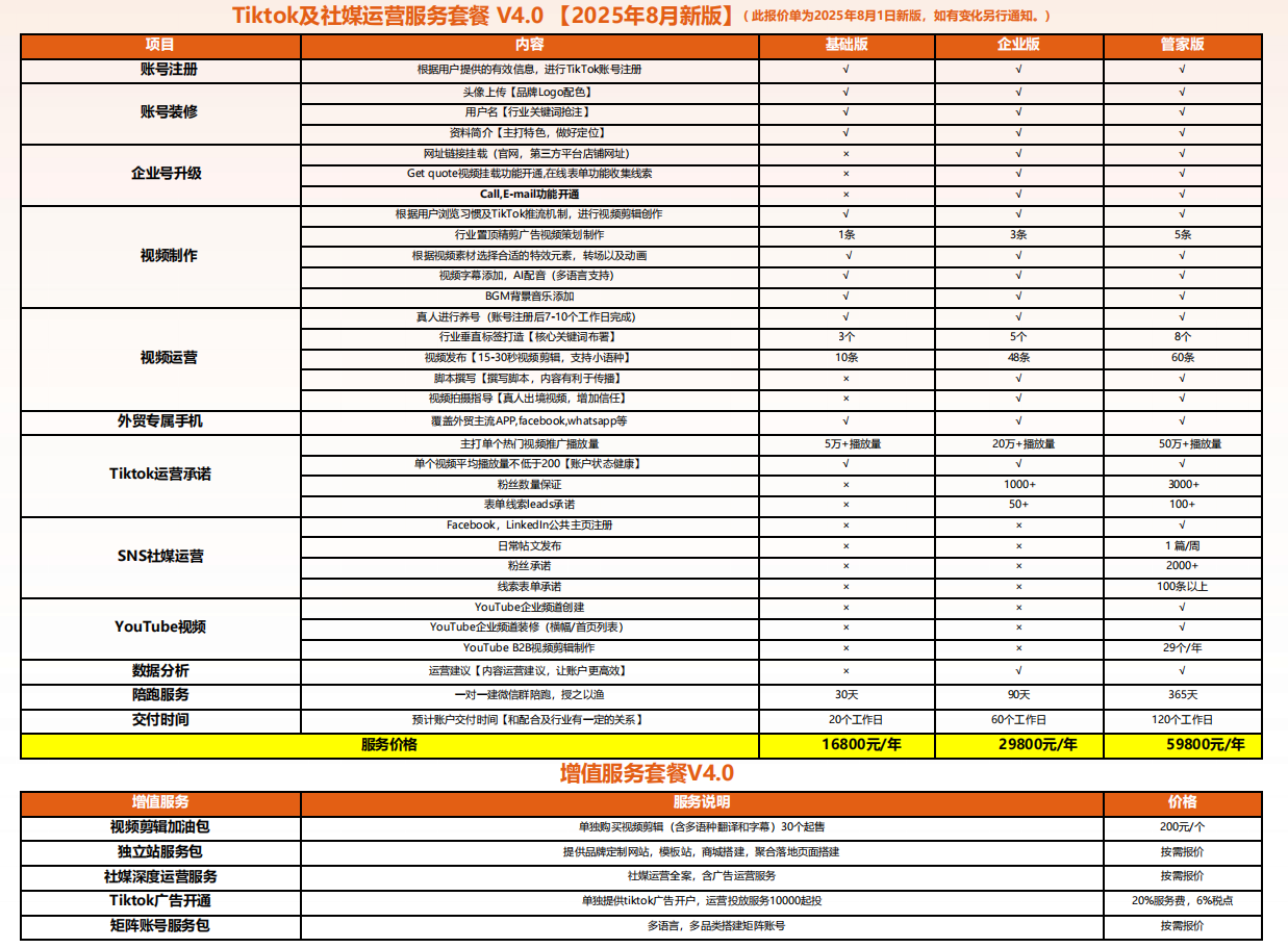 根據(jù)企業(yè)需求,我們提供多種靈活的TikTok代運營套餐,滿足不同規(guī)模企業(yè)的出海需求